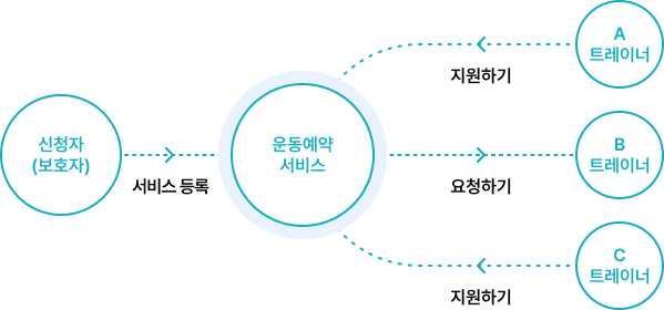 신청자가 서비스를 등록하면 트레이너가 지원을 하거나, 신청자가 트레이너를 검색하여 요청을 할 수 있습니다. 신청자는 원하는 트레이너를 최종 선택하여 매칭을 완료 합니다.