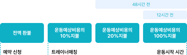 원활한 서비스를 위해 선결제로 진행이 됩니다. 선결제 비용은 운동 예상시간을 기준으로 예상비용이 산출되고, "예상비용 X 2"를 선결제 합니다. 모든 시간에 따른 비용은 운동 예상시간이 아닌, 실제 운동 시작과 끝 시간을 기준으로 산정합니다. 선결제 금액에서 최종 운동시간에 따라 산정되는 비용 외에는 모두 돌려 드립니다. 추가시간은 30분 단위이긴 하지만, 30분 이후, 10분 이내는 추가 비용이 발생하지 않고, 10분이 초과된 시점부터 30분에 대한 추가요금이 발생합니다. |